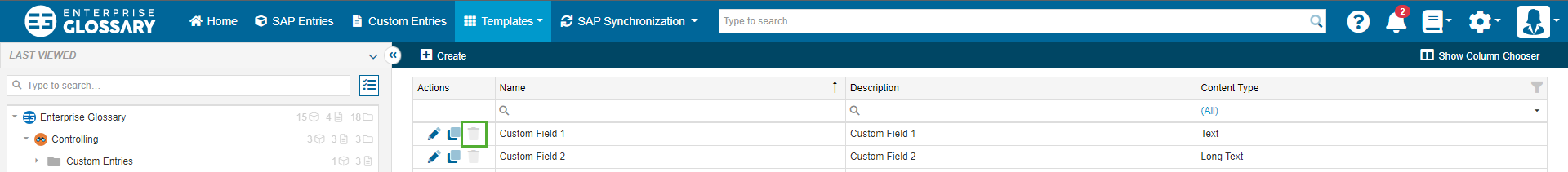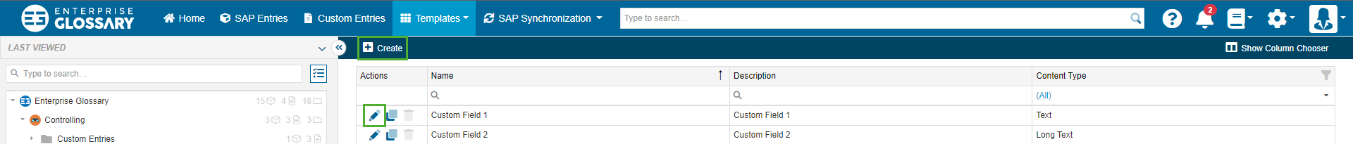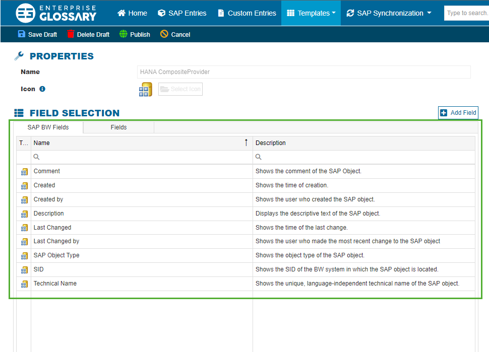 Fields are used to display information in an Entry. There are two different types of Fields in the Enterprise Glossary: SAP Fields, which are automatically filled with the metadata, that is synchronized out of the SAP system, and Custom Fields, which can be freely created and have to be filled with information manually.