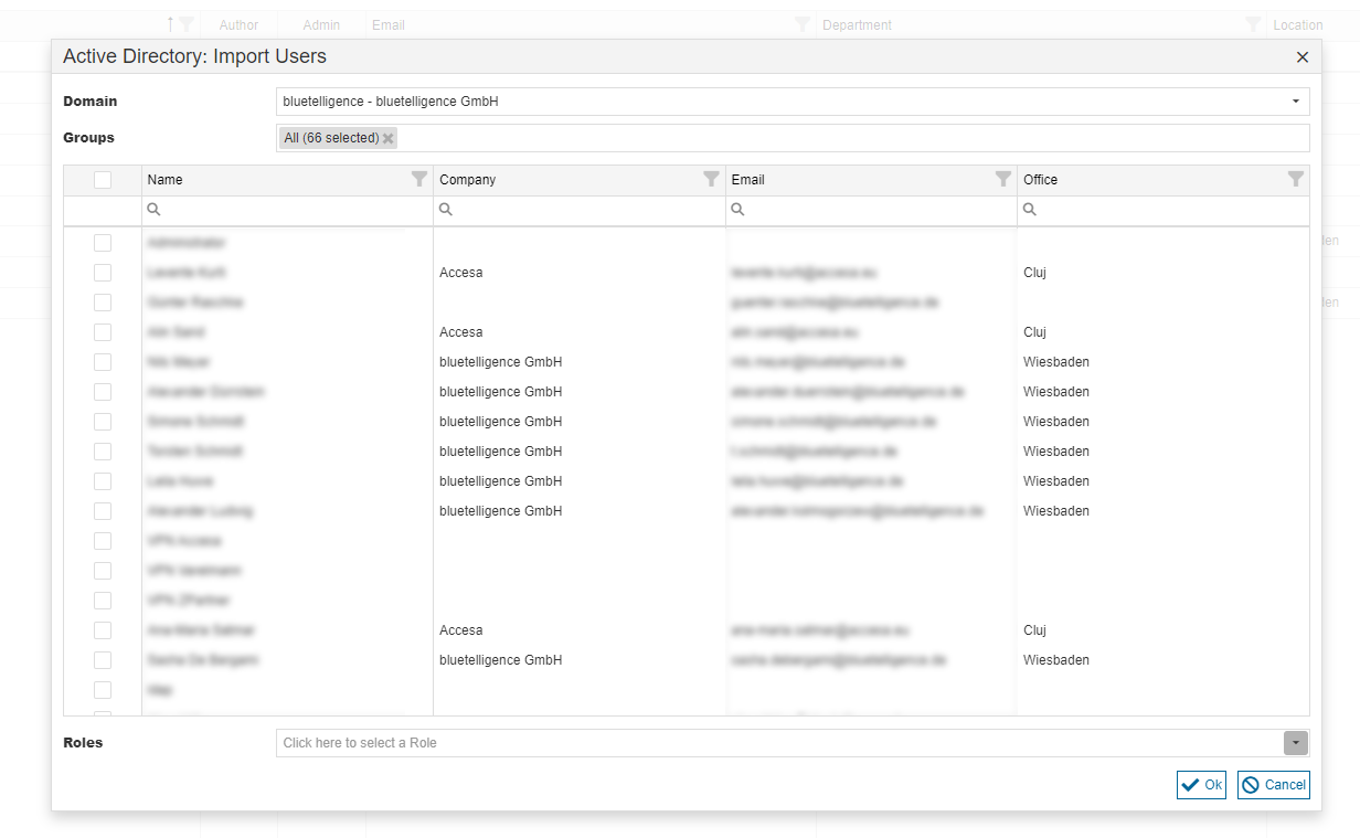 In the appearing pop-up, you have to select the domain and group. The domain first has to be maintained in the settings. The Users to be imported can then be selected in the table. Finally the roles, that should be assigned, can be selected in the dropdown.