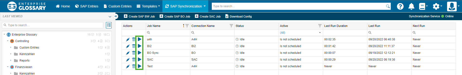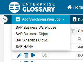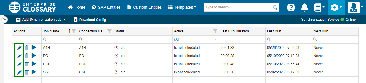 Synchronization Jobs use the created SAP Connections to make the supported object types available as Entities. Synchronization Jobs can be accessed by clicking Synchronization Jobs.