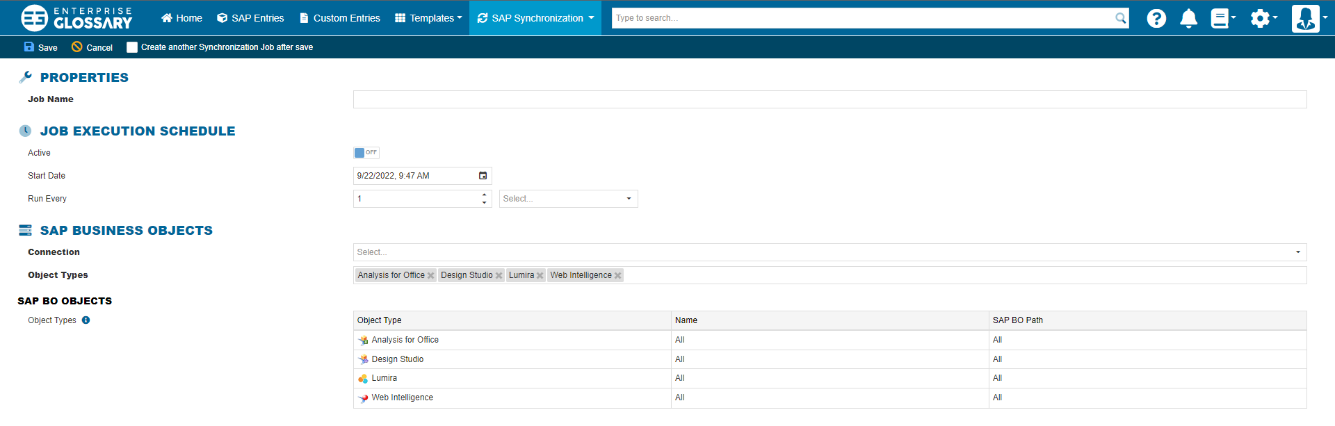 The connection used for the job and the object types, that should be synchronized have to be selected here. In the SAP BO Objects area, a namespace or SAP BO path can be selected for every object type.