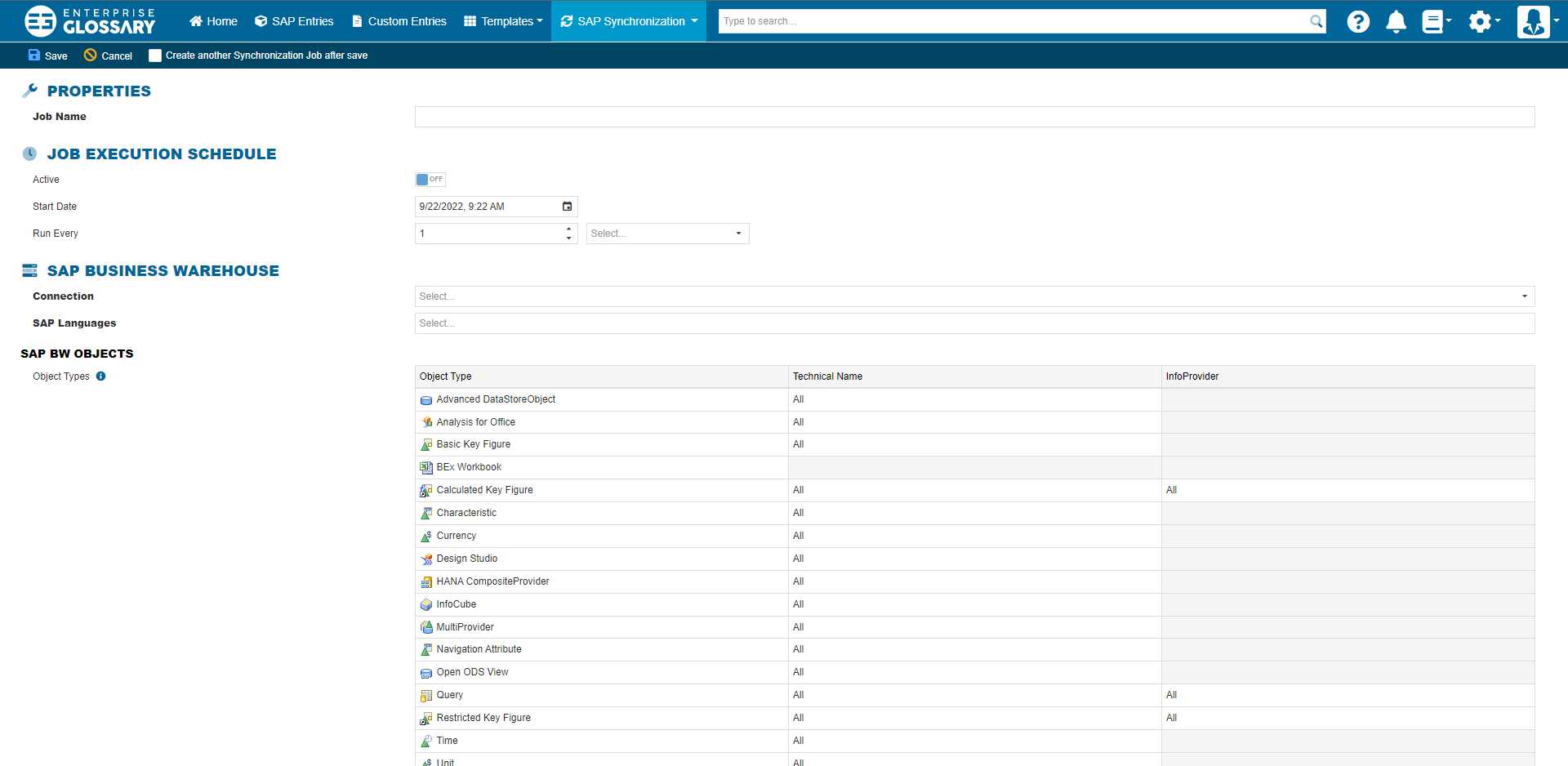 The connection used for the job and the languages, that should be synchronized have to be selected here. In the SAP BW Objects area, a namespace or InfoProvider can be selected for every object type.