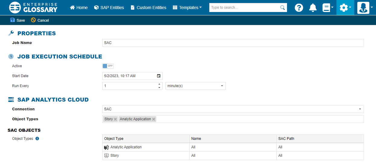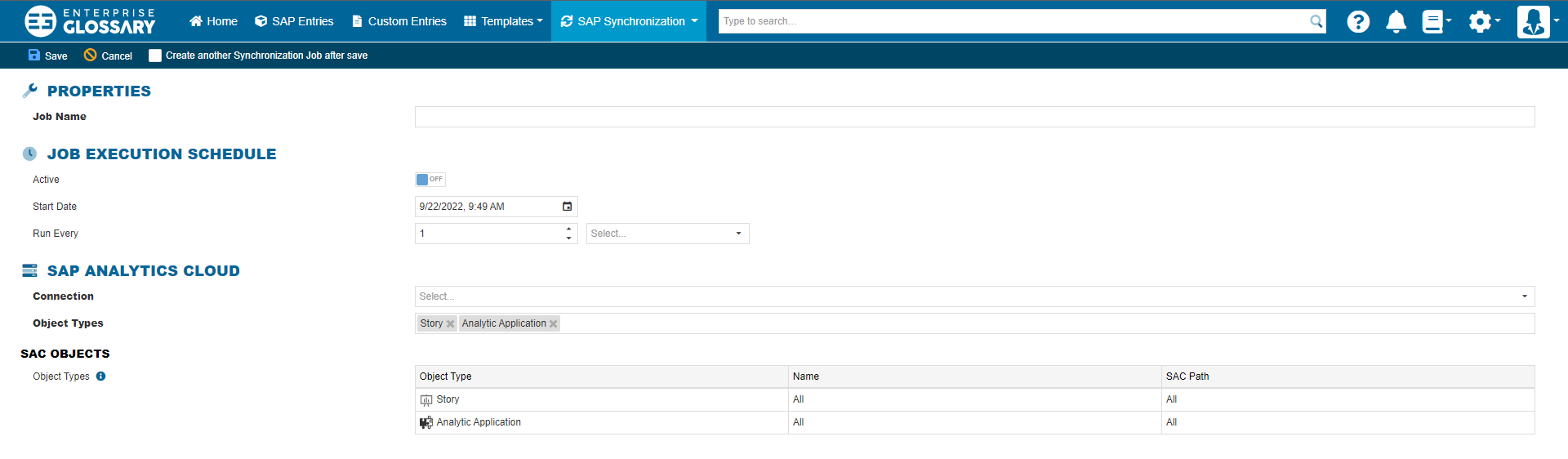 The connection used for the job and the object types, that should be synchronized have to be selected here. In the SAC Objects area, a namespace or SAC path can be selected for every object type.