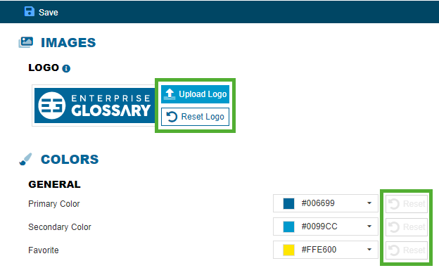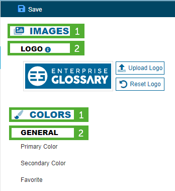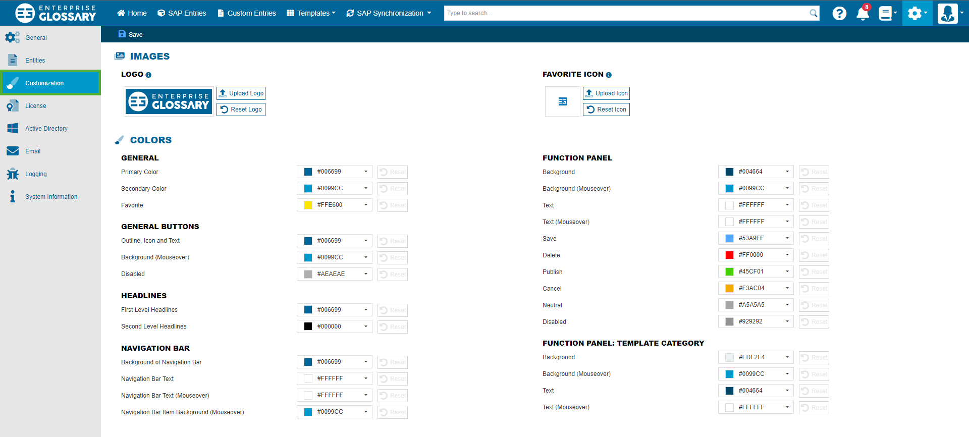 In customization, the appearance of the Enterprise Glossary can be adjusted by changing icons and logos as well as colors.