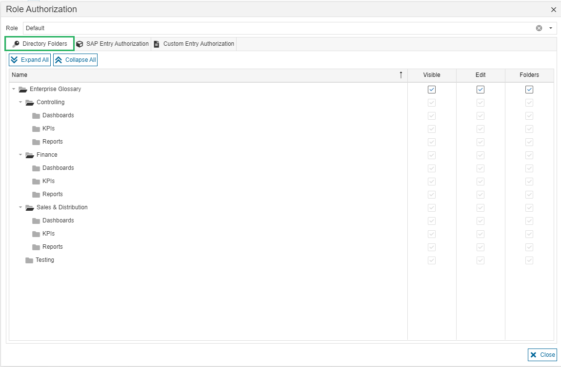 Visible: Affects all Users but Administrators. When enabled, the selected Role grants the ability to see the Folder and the items (linked Entities etc.)that the folder contains. When disabled, the selected Role hides the Folder and its items. The user can still get Visibility Right by means of another role.