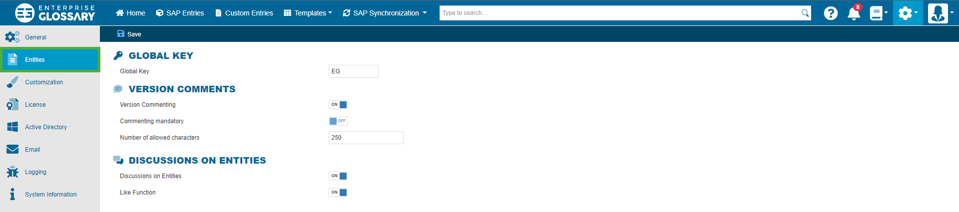 The global key is the first part of the Entity key that allows you to identify each Entity in the glossary. Choose a key that represents your entire glossary, or use the default key.