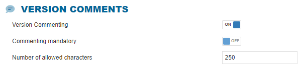 In this area, you can adjust if Version Commenting should be active, and if it is active, you can make it mandatory and limit the number of allowed characters.