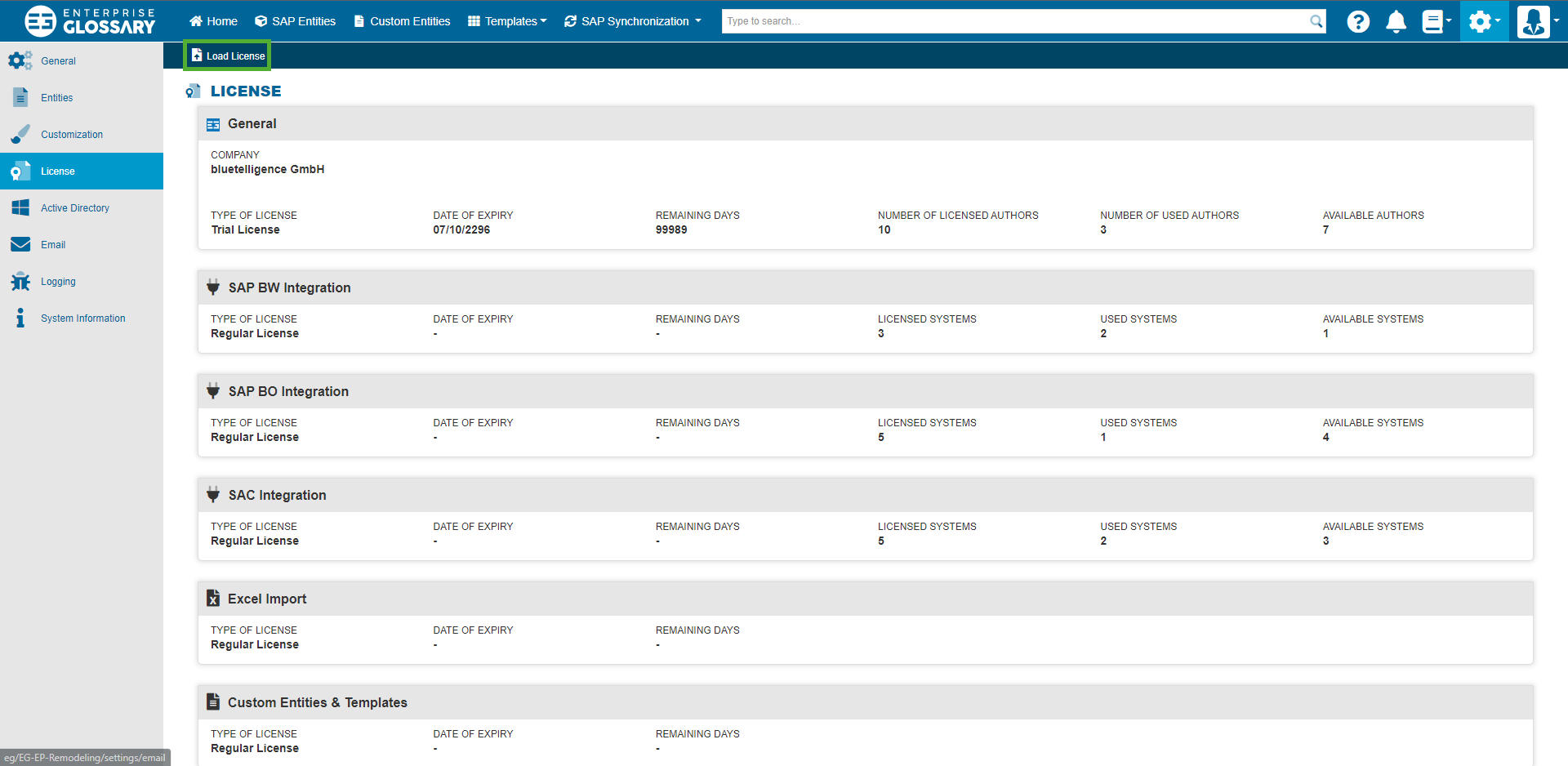 In the license settings, you can see the specifics of your license. This includes the type of license, the expiration date and the remaining days, and the licensed, used and remaining authors. For the connectors, instead of the users, the licensed, used and available systems can be displayed. A new license can be uploaded by clicking Load License.