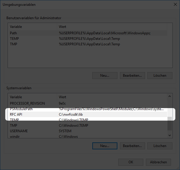 In order for the SAP NetWeaver SDK to be found, the path to the lib directory must be added to the system environment variable "Path". You enter the system environment variable under Control Panel > System.