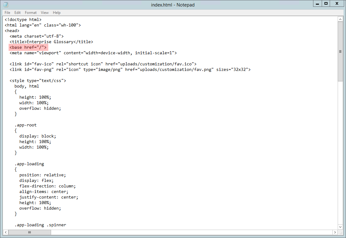 The <base href = "/"> must be changed to <base href = "/application path/">, for example, <base href = "/EnterpriseGlossary/"> if "EnterpriseGlossary" was selected as the application path.