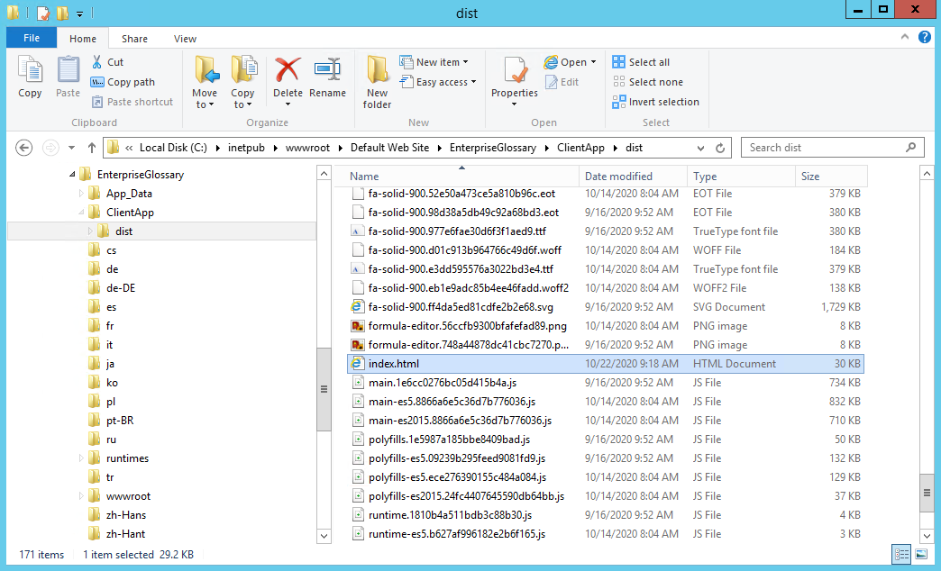 The index.html is located under ClientApp\dist.